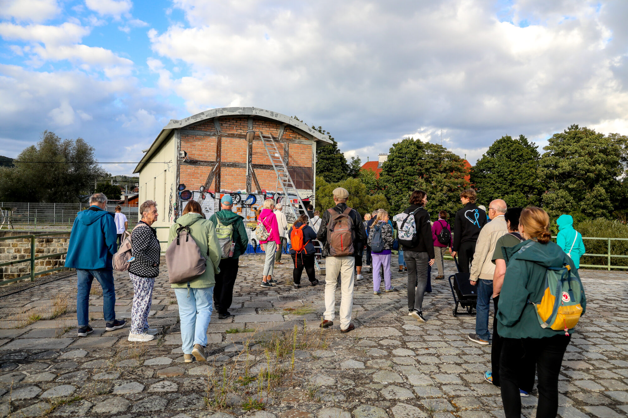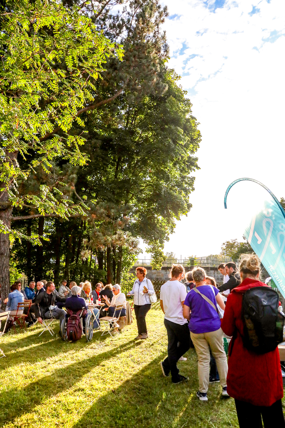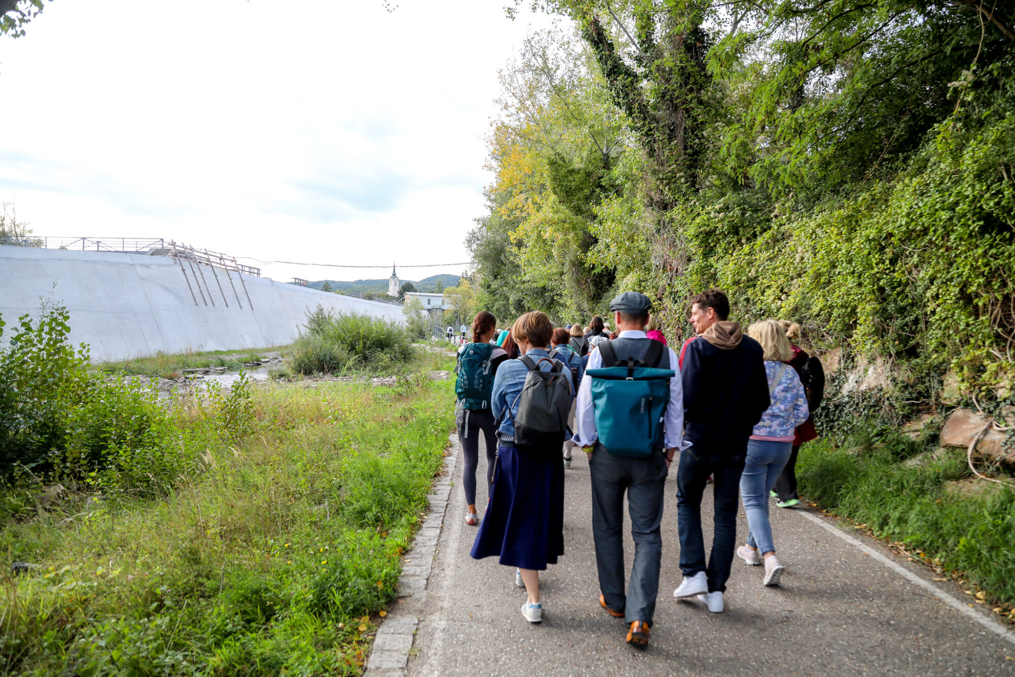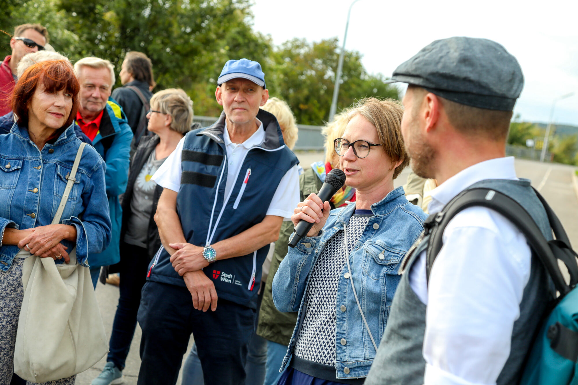 Nach der Sommerpause der Geh-Cafés ging es bei schönem Wetter in den Westen von Wien, um bei Wolf in der Au mehr über den Hochwasserschutz in Wien zu erfahren. Begrüßt wurden die Spaziergeher*innen von Georg Brockmeyer von der Mobilitätsagentur und der Bezirksvorsteherin von Penzing Michaela Schüchner.