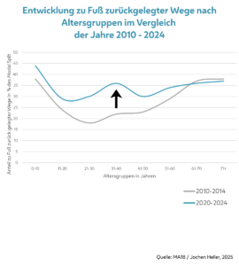 Vor allem junge Single-Haushalte (bis 35 Jahre) und Alleinerziehende verfügen oft über kein eigenes Fahrzeug. Der Anteil der mit dem Pkw zurückgelegten Wege ist bei den 21- bis 30-Jährigen vor allem in den vergangenen zehn Jahren deutlich gesunken – nämlich um fast zehn Prozentpunkte! Signifikant war der Rückgang vor allem bei den Männern.