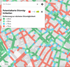 Gut versorgte Bereiche von bis zu 100 Metern zwischen zwei Sitzgelegenheiten sind grün gekennzeichnet. Darüber hinaus zeigen v.a. rote Flächen den Mangel von Sitzmöglichkeiten an.