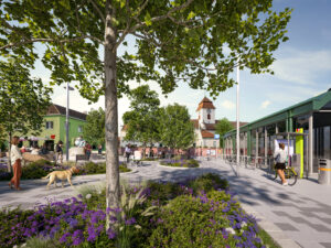 Die Aufenthaltsfläche am Platz rund um den Froschkönigbrunnen wird mit einem hellen Pflaster neugestaltet, wodurch sich der Bereich in der warmen Jahreszeit nicht so stark aufheizt. Dadurch entsteht eine durchgehend barrierefreie Fläche, die von allen Menschen sicher und komfortabel benutzbar ist. Gleichzeitig ermöglicht die ungebundene Bauweise, dass Regenwasser gut versickern kann. Ein neuer Trinkbrunnen spendet bald frisches Trinkwasser und sorgt für eine zusätzliche Kühlung während der Sommermonate.
